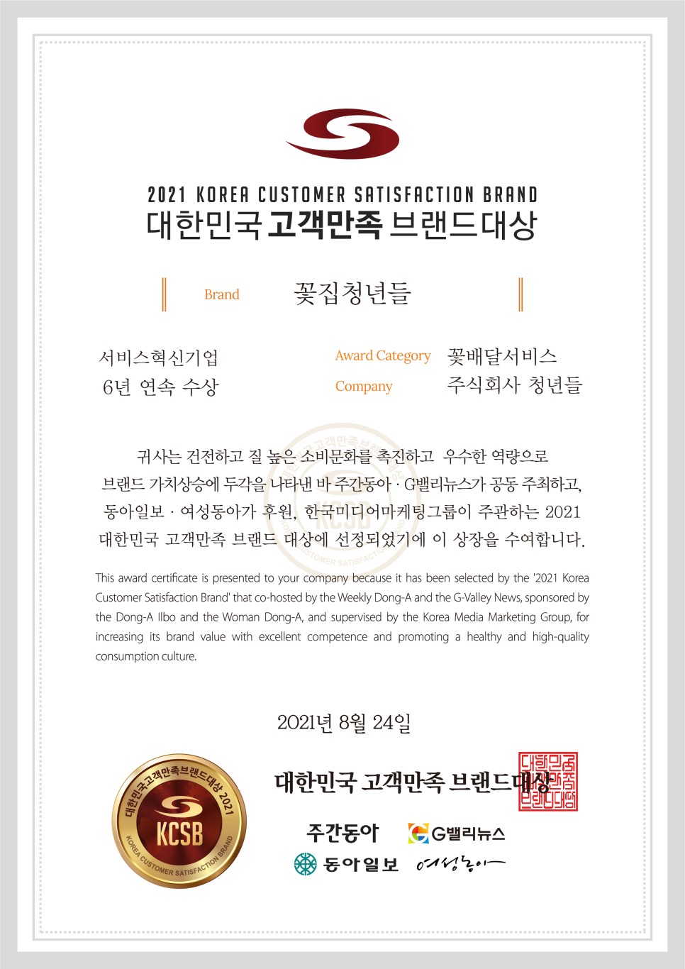꽃집청년들이 서비스 혁신기업 꽃배달 부문에서 6년 연속 고객만족 브랜드 대상을 수상하게 되었습니다 :)