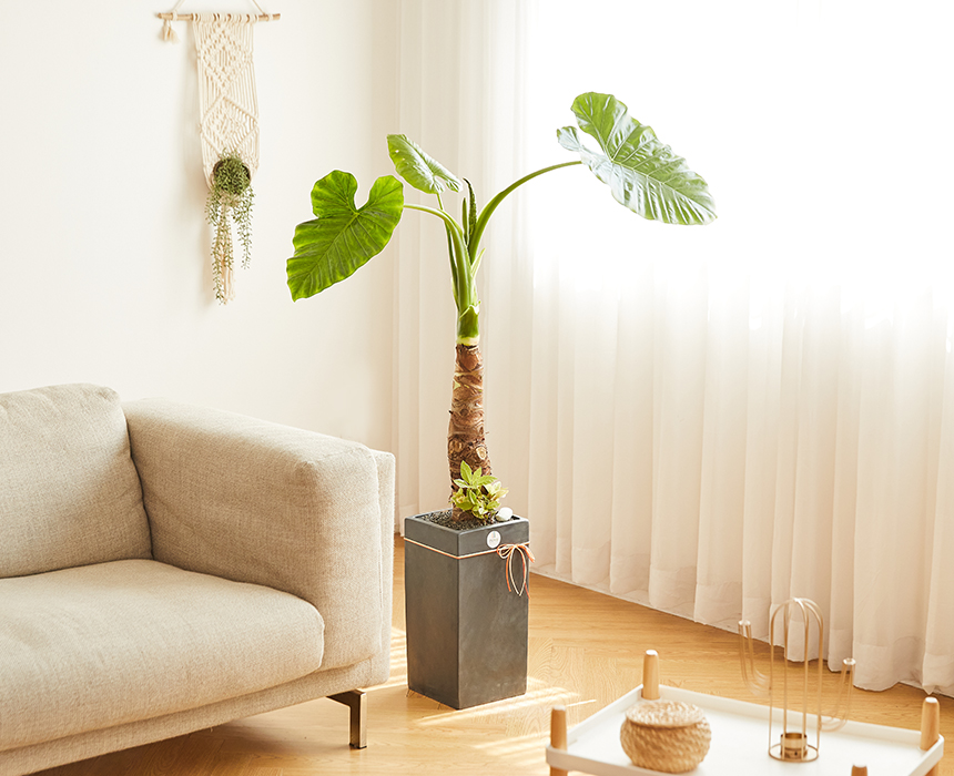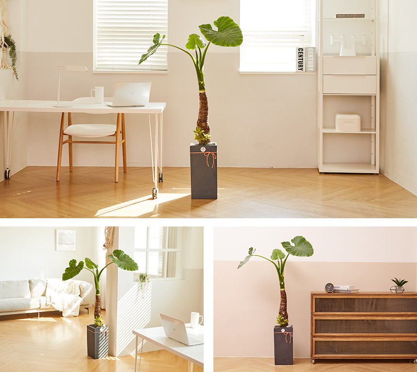 알로카시아는 창가에서 떨어진 벽 쪽에 위치해 키우는 것이 좋습니다. 직사광선 아래 자리하면 잎뎀현상으로 잎이 타기 때문에 음지에 위치하도록 신경 써 주시고, 물 주기는 여름에만 신경 써서 주시면 됩니다.