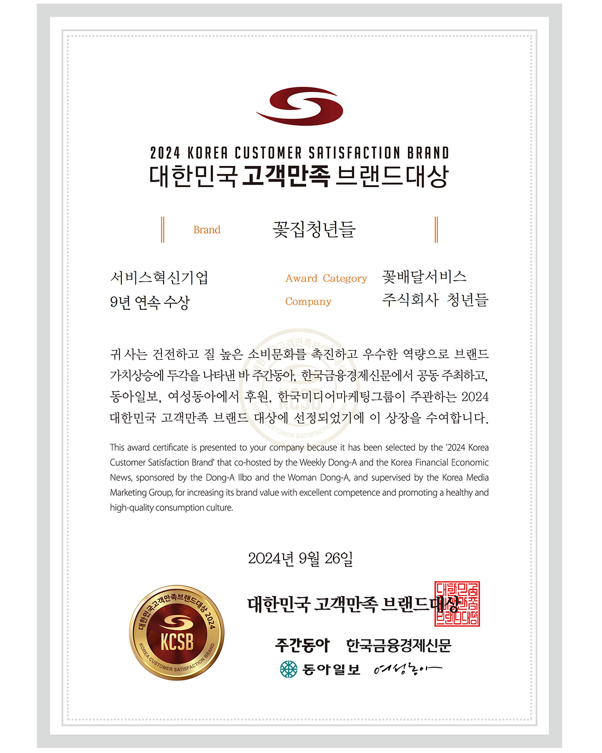 고객만족브랜드대상 서비스 <서비스혁신기업-꽃배달 부문>에서 9년 연속 대상을 수상했습니다.